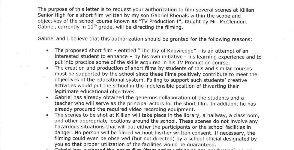 From 2002, a letter my dad wrote to the principal of my high school defending production of my first short film, Mass Education (then titled, The Joy of Knowledge), and contesting an egregious suggestion that I file for a permit and insurance when I wanted to film on school grounds.